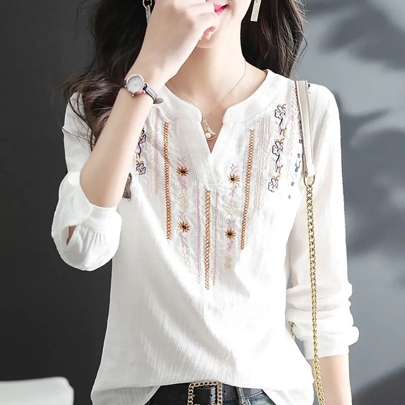 Camicia a maniche lunghe bianca in cotone da donna incinta primavera e autunno 2023 ricamo sciolto stile etnico con scollo a v Top premaman LF060
