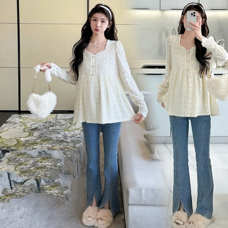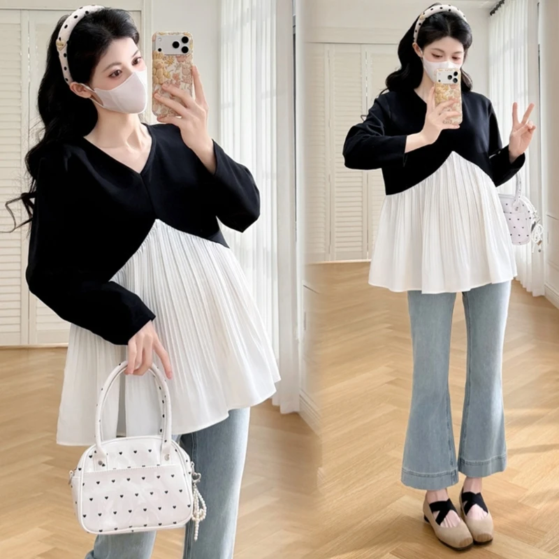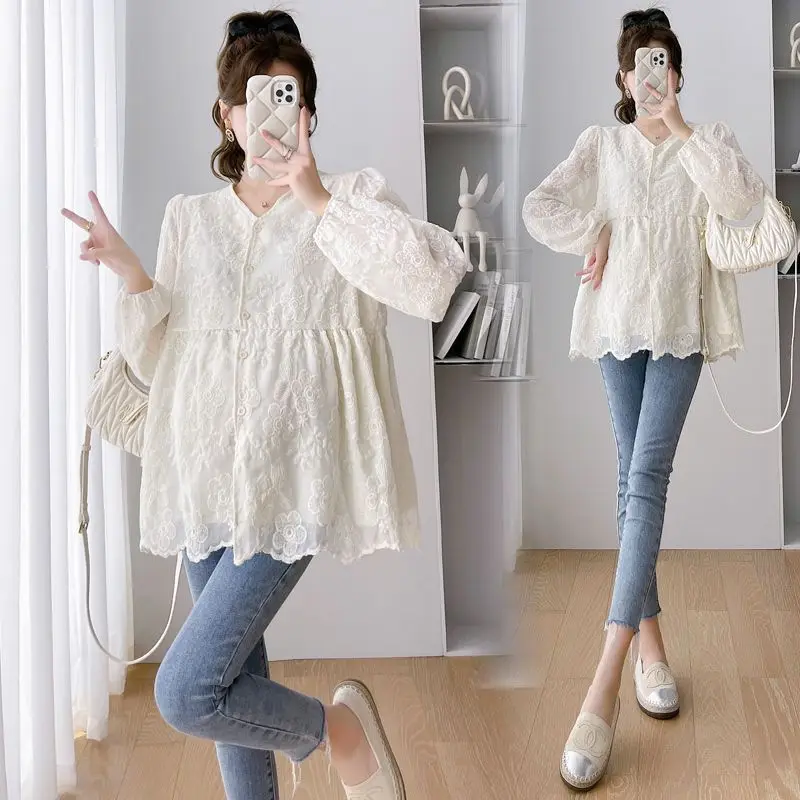 2025 Primavera delle donne incinte Top Nuovo pizzo allentato Capispalla delle donne incinte Moda Top Maternità Camicia a maniche lunghe Top LI225
