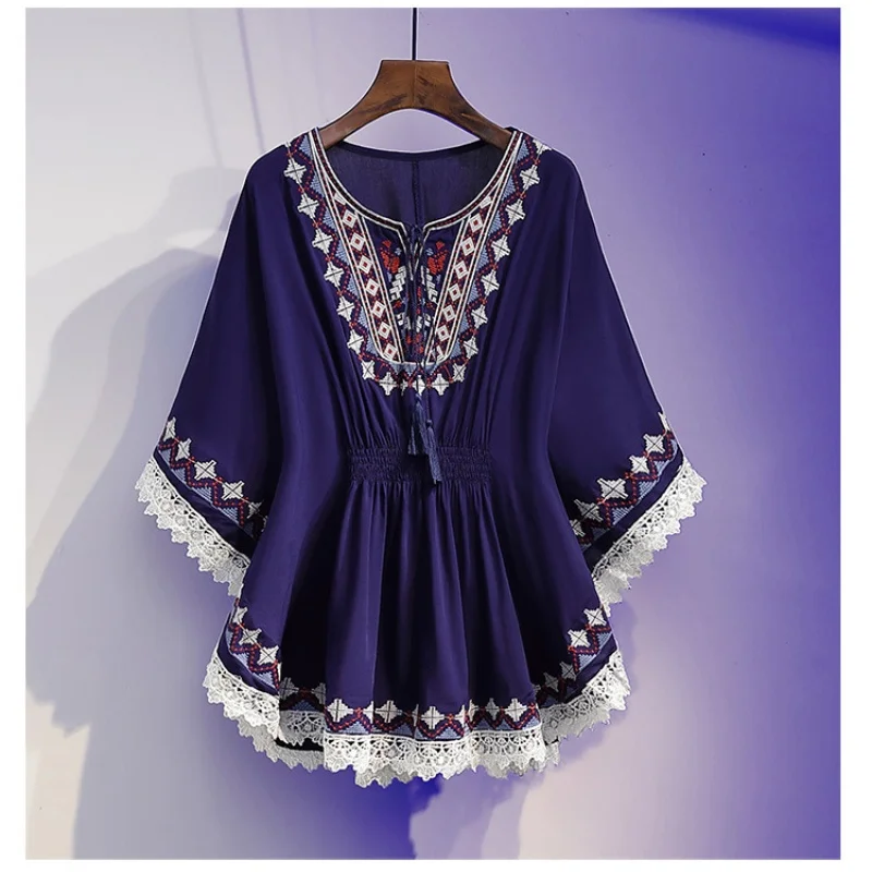 Magliette estive da donna in stile retrò boho, bluse ricamate, top a mantella, camicie kimono a maniche a pipistrello con orlo in pizzo di cotone, blusa femminile.