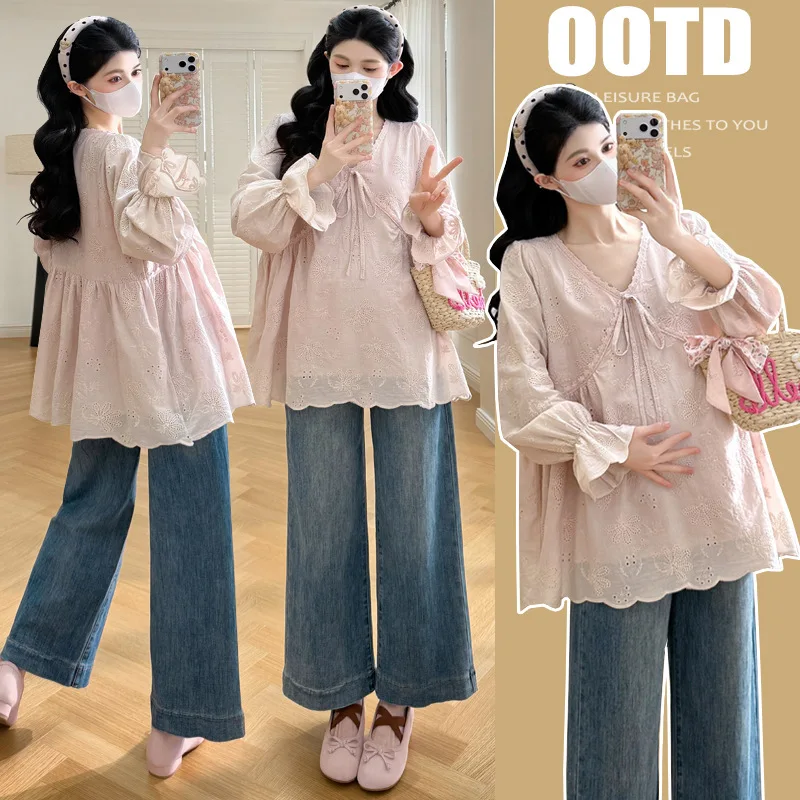 Top Premaman Primavera 2026 Nuovo Stile Manica Lunga Ricamato Scollo a V Maniche a Sbuffo Outfit alla Moda per Mamme Trendy