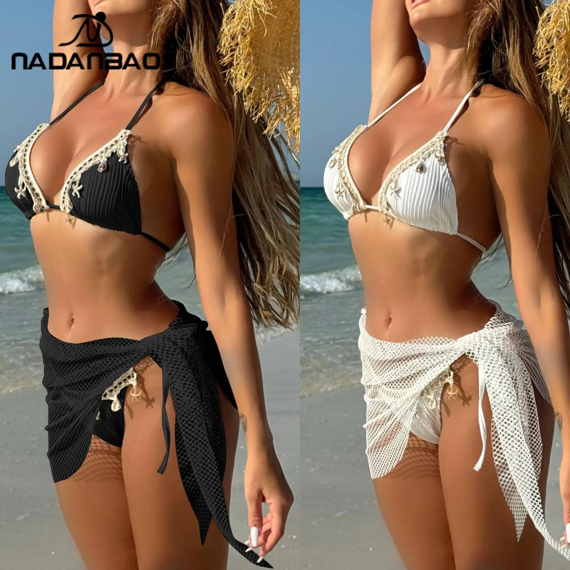 Nadanbao Moda Donna Stella marina Nappa Bikini a tre pezzi Set Maglia trasparente Gonna corta Costumi da bagno Costume da bagno sexy a triangolo da spiaggia