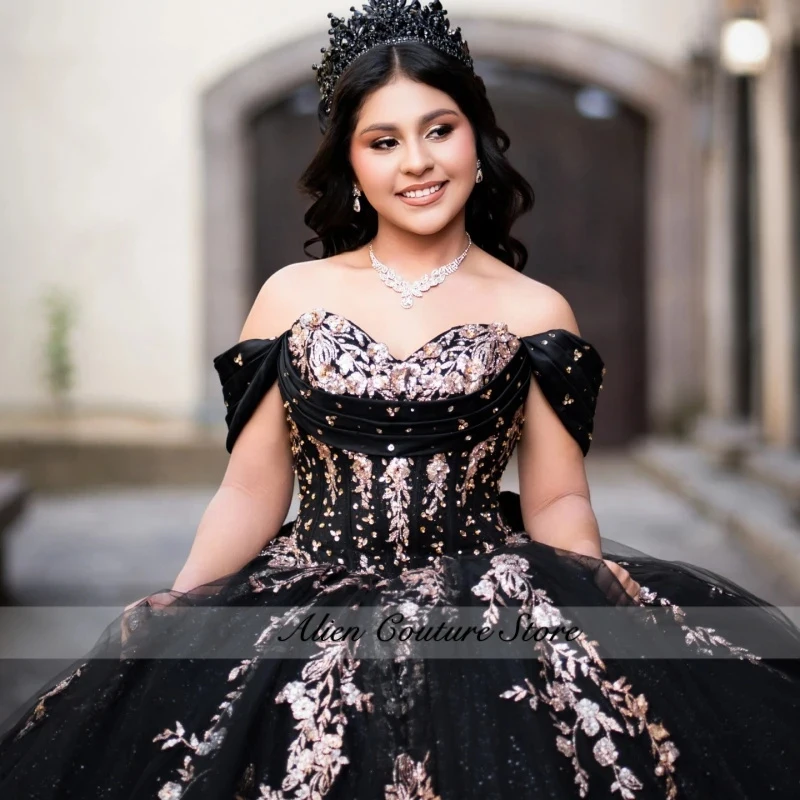 Abito Nero Lucido da Principessa per Festa dei 16 Anni, Vestito Quinceanera con Applicazioni in Pizzo, Perline e Tulle, Abito per Compleanno e Festa dei 15 Anni