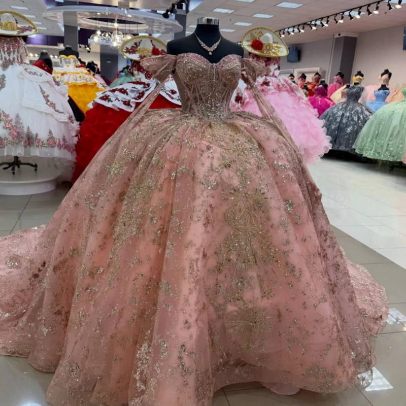 Abiti da Quinceañera Rosa Brillante, Vestito da Ballo con Spalle Scoperte, Applicazioni in Pizzo, Perline e Cristalli, Abito per Festa di Compleanno, Vestito per Sweet 16