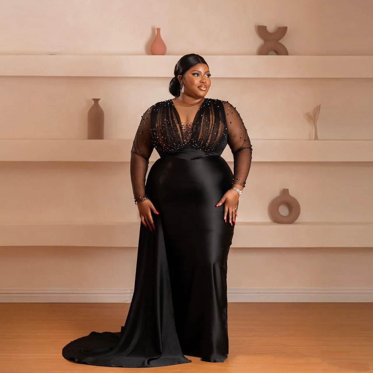Abiti da Sera con Maniche Lunghe Trasparenti, Eleganti Abiti da Cerimonia Neri Taglie Forti, Splendido Vestito Formale con Perline e Gonna Rimovibile