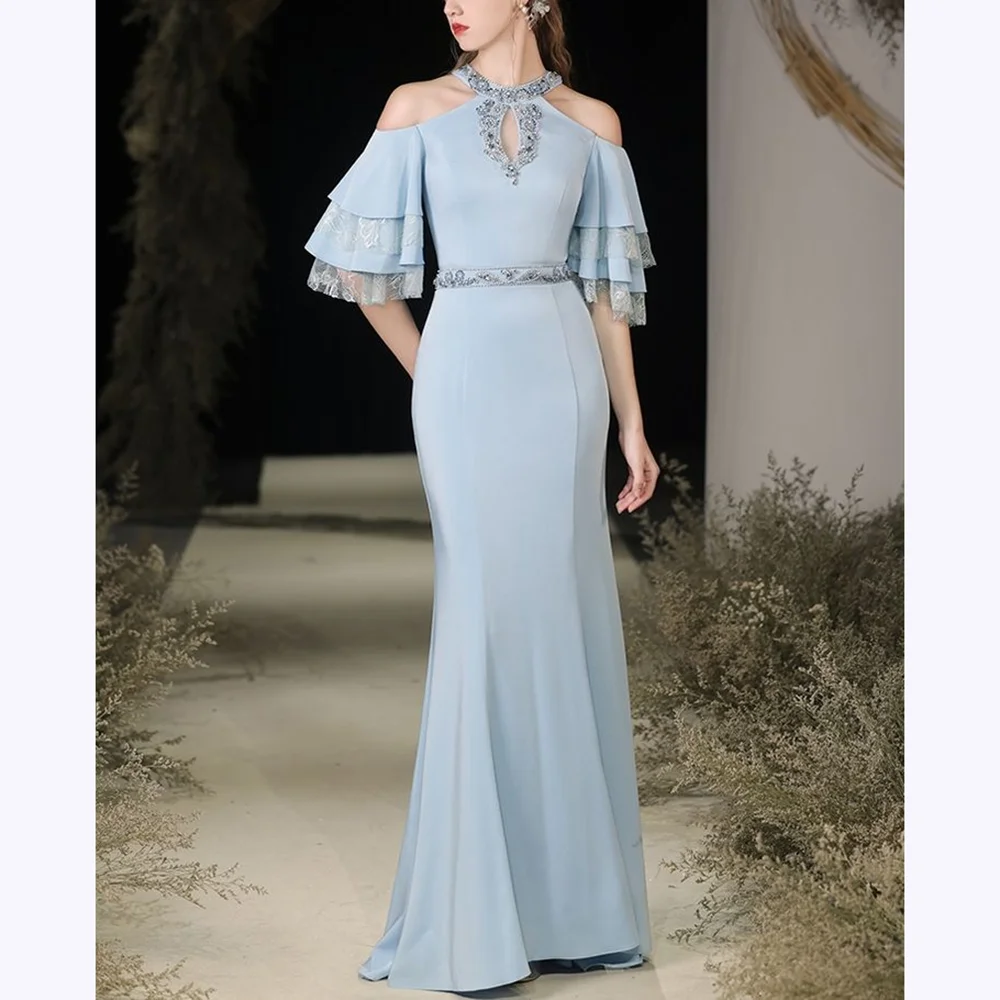 Abito da sera in raso azzurro cielo Halter Glitter Perline Paillettes Sirena Abiti da ballo Lunghezza pavimento Occasioni formali Abito elegante da donna