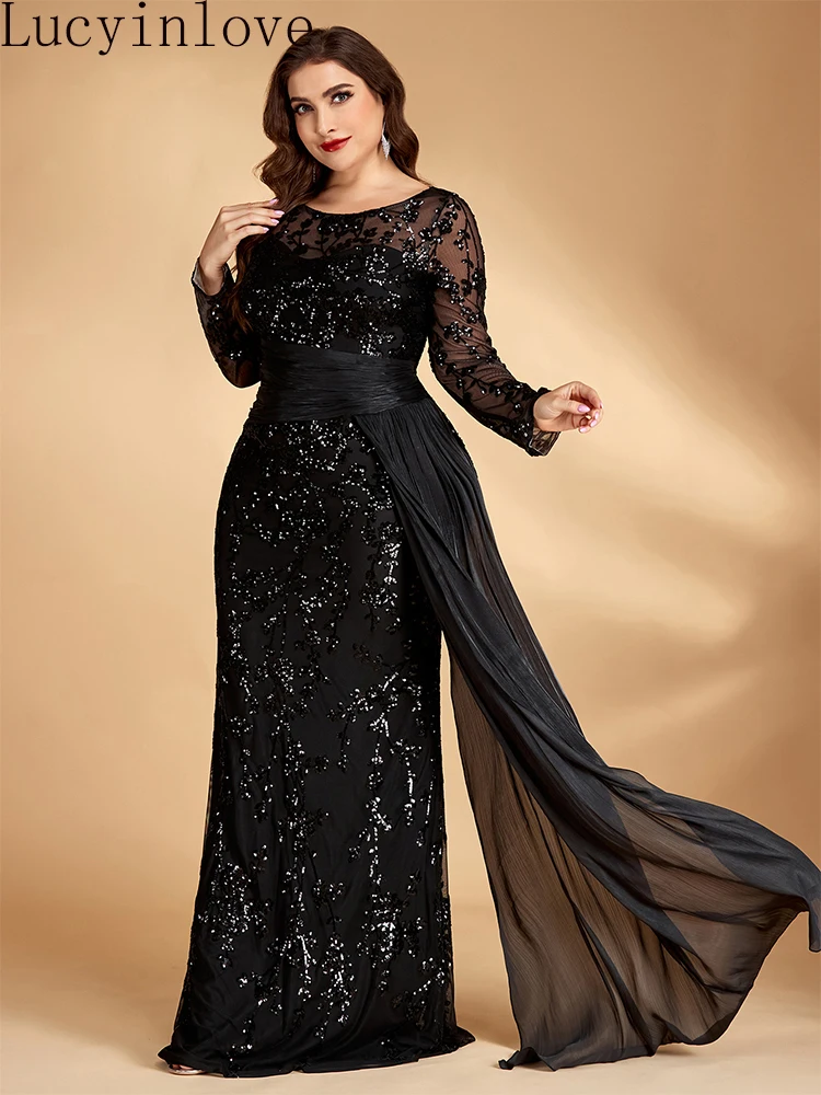 Lucyinlove Abito da Sera Elegante Taglie Forti con Maniche Lunghe, Paillettes, Nastri e Pieghe, Lussuoso Vestito da Cerimonia Lungo fino a Terra