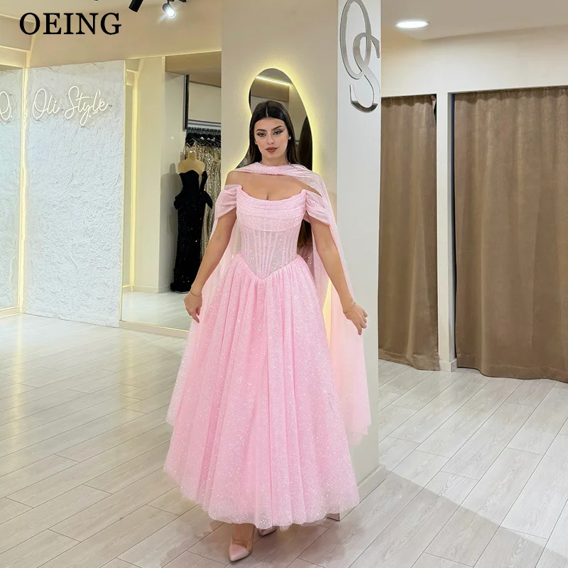 OEING Abiti da ballo A-Line da principessa scintillanti in tulle con glitter stellati, abito da sera drappeggiato con spalle scoperte, abiti da festa midi personalizzati