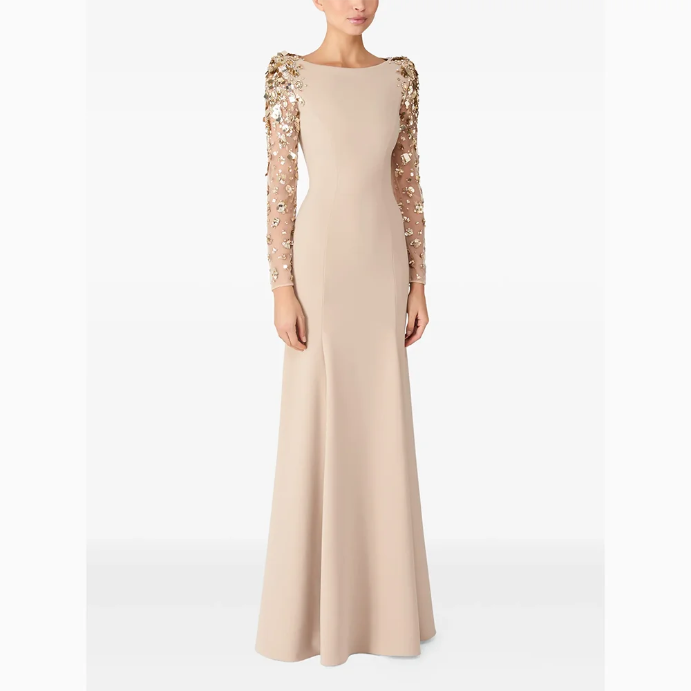 Abiti da sera semplici Scollo a barca Maniche lunghe Abiti da ballo Cristallo Elegante occasione formale Abito da sera lungo fino al pavimento Personalizzato