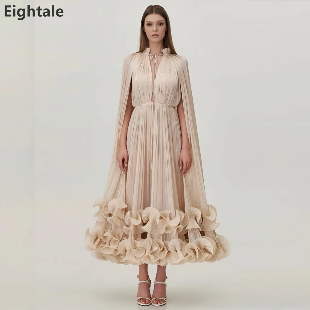 Eightale 2025 Champagne A Line Tea Length Abito da sera in seta con volant Abito da ballo formale Dubai Abito da festa di nozze personalizzato