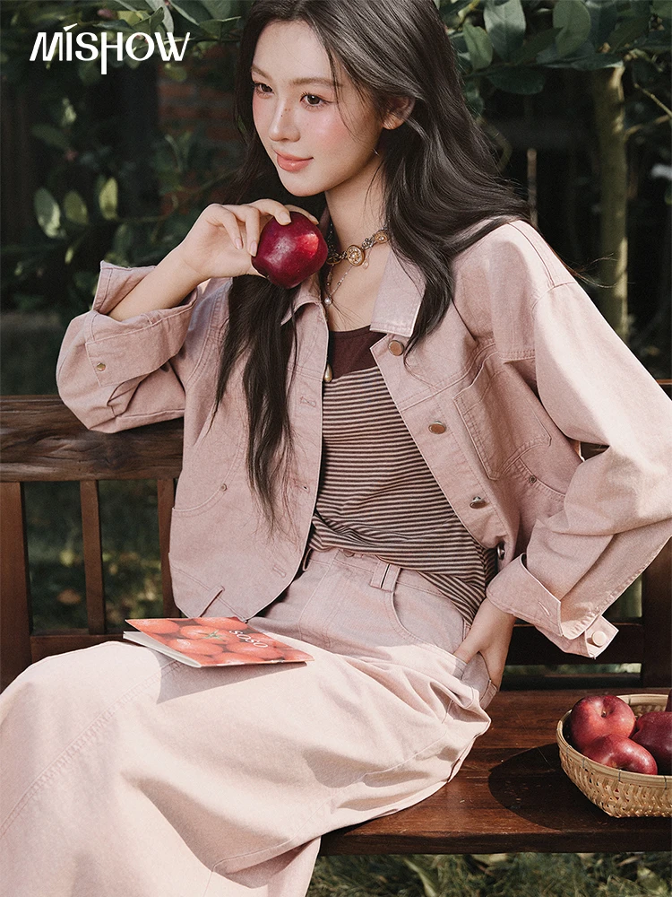 MISHOW Giacca in denim 100% cotone con colletto a risvolto, tasca sul petto, monopetto, casual, vestibilità ampia, rosa, Primavera 2026 MXF14W1060