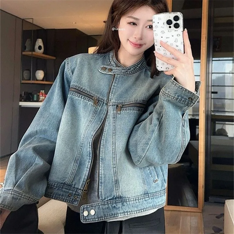 Nuova Giacca in Denim da Donna con Colletto Rialzato, Giacca Corta Larga Primaverile e Autunnale, Giacca Basica Femminile Retro Lavata Stile Motociclista con Cerniera