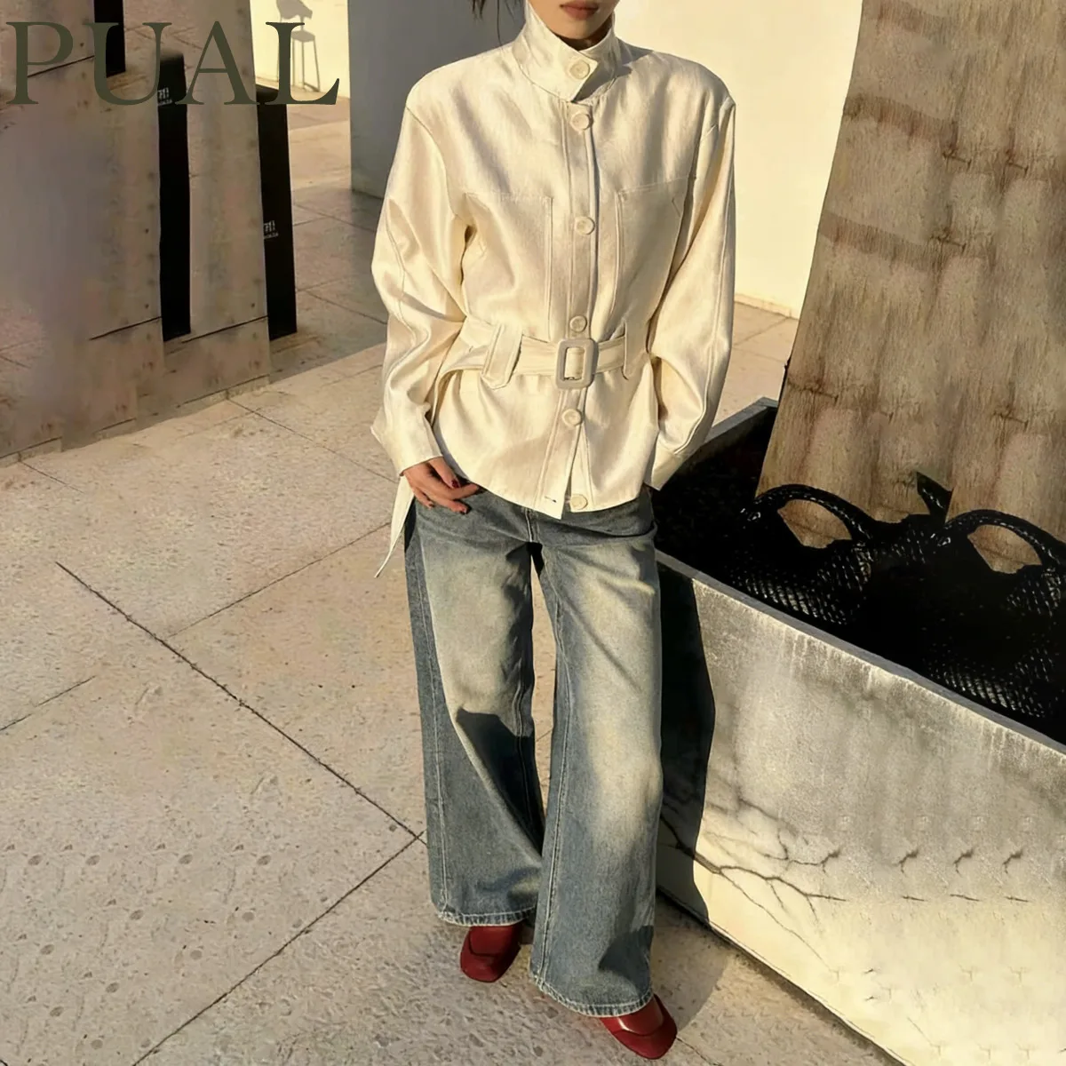 PUAL 2025 Giacca Primaverile da Donna in Raso Beige con Cintura | Giacca a vento con colletto rialzato e bottoni | Abbigliamento esterno oversize modesto