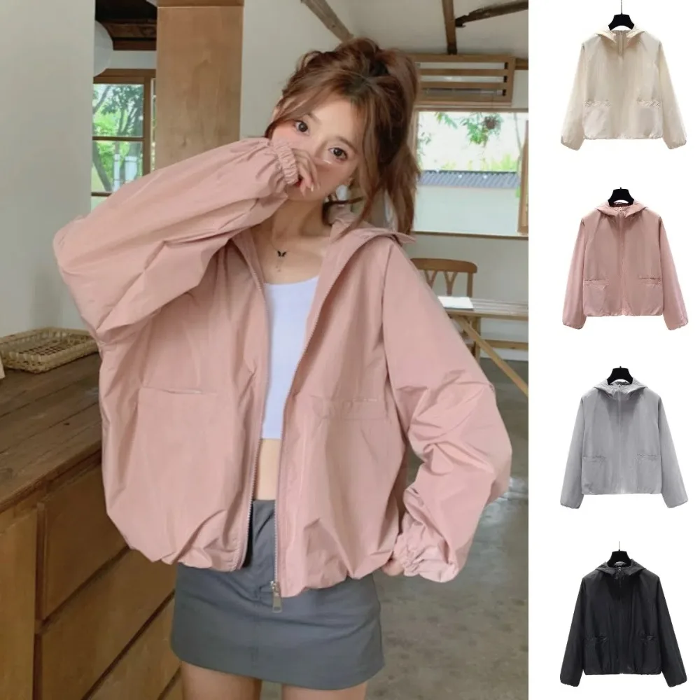Felpe coreane sottili larghe con cappuccio a maniche lunghe con coulisse retrò per le donne, abbigliamento per la protezione solare, cardigan con cappuccio per le vacanze