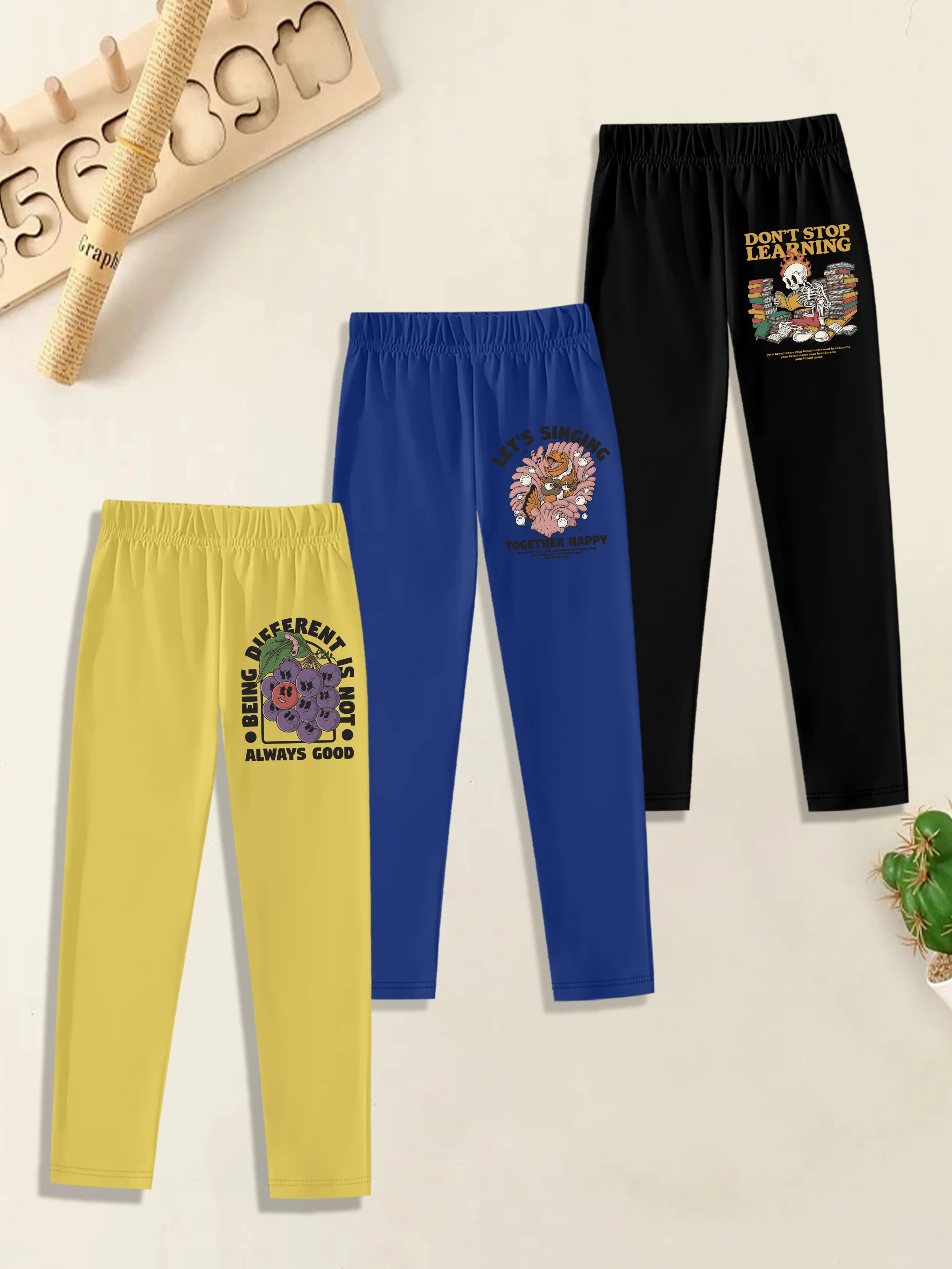 3 pezzi: leggings casual autunnali da ragazzo: stampa di uva, pesce e teschio dei cartoni animati
