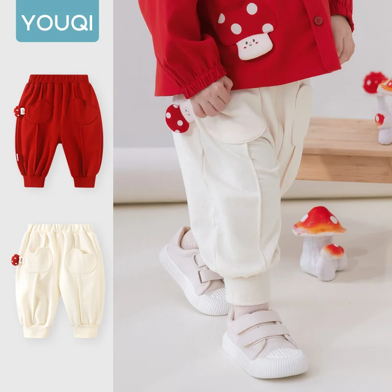 【Youqi】Pantaloni cinesi per bambini da 0 a 2 anni, pantaloni lunghi unisex per bambini, pantaloni casual da jogging con design a forma di fungo per le gite