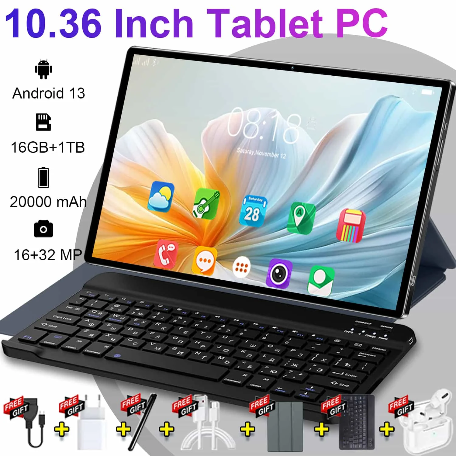 Tablet PC Android 13 da 10.36" HD, 14 Core, 16GB+1TB, 20000mAh, 5G Dual SIM, Fotocamera 16MP+32MP, Bluetooth, GPS, WPS Office