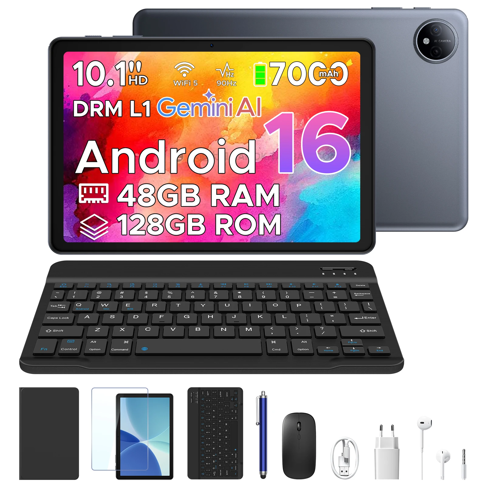 POCKAM P10 Android 16 2 in 1 Tablet PC da 10.1" con AI Gemini, Batteria da 7000mAh, Supporto Widevine L1, 48GB RAM (8+40) 128GB ROM