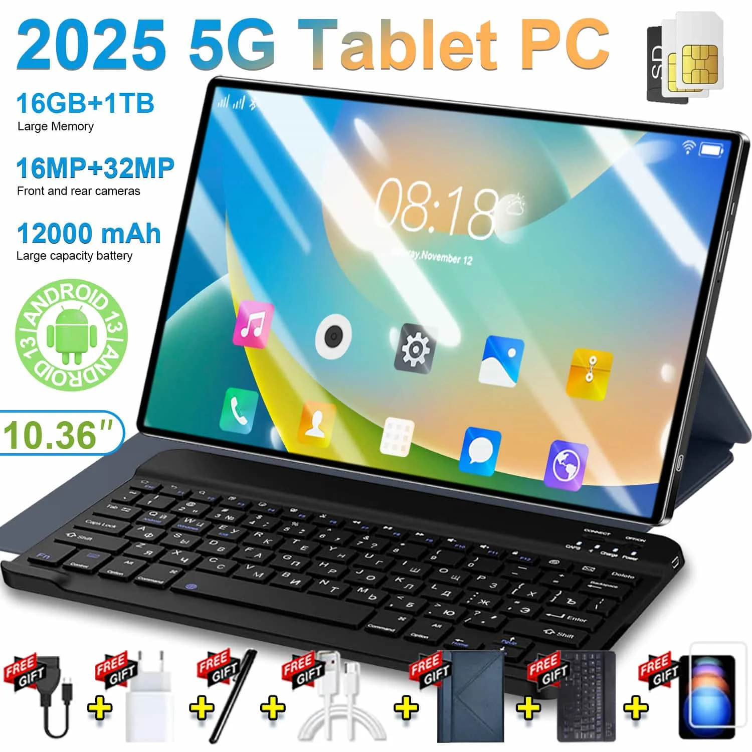 2025 Originale Tablet Android da 10.36 pollici 12000mAh 5G WIFI GPS 16GB + 1TB 14Core Dual SIM 16MP + 32MP HD Bluetooth Ufficio Studente Uso