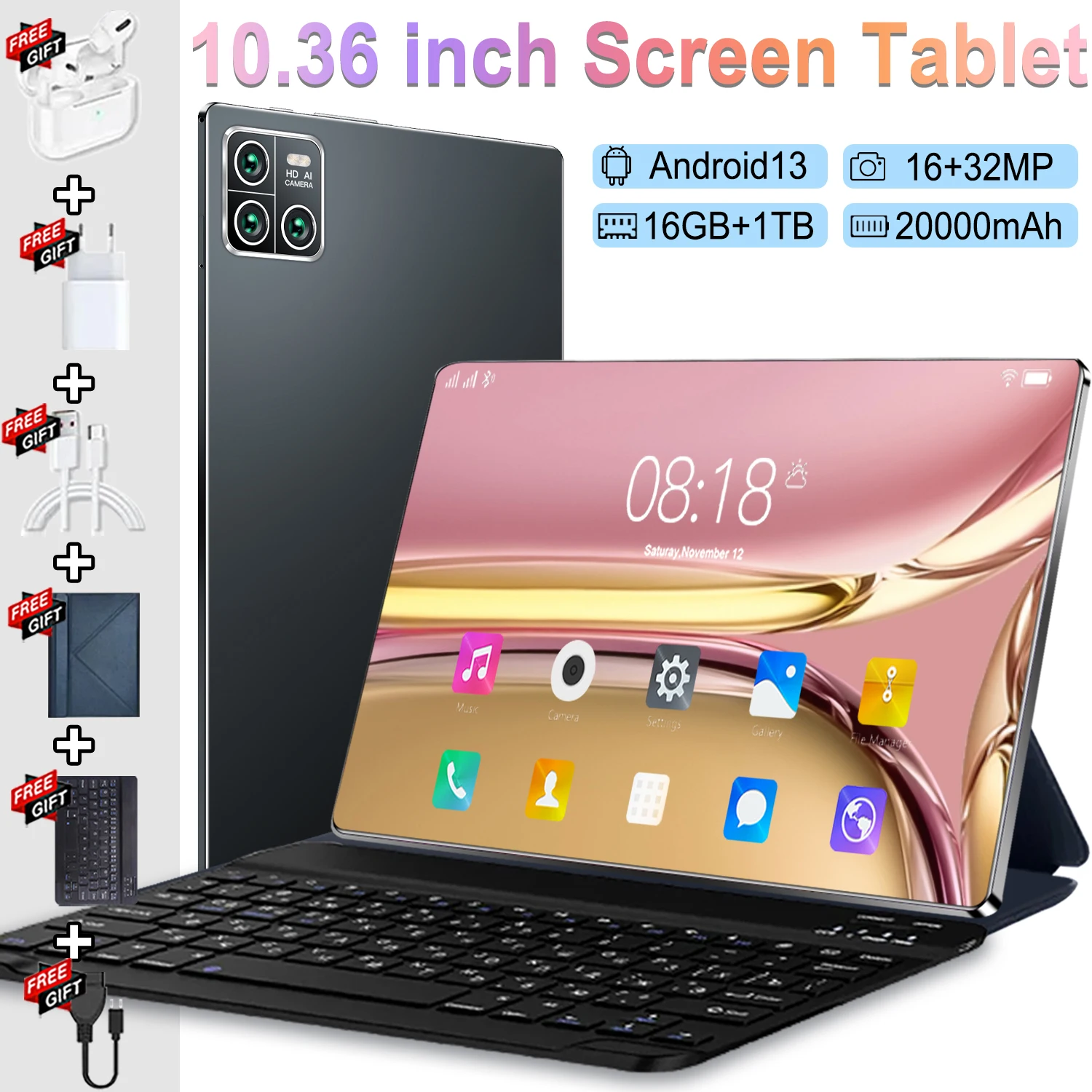 Nuovo Tablet 5G Globale da 12000mAh, 16GB RAM, 1TB ROM, 10 Core, Dual SIM, Fotocamera 16MP+32MP, Schermo 10.36 Pollici, Android 13.0, WPS Office, Bluetooth