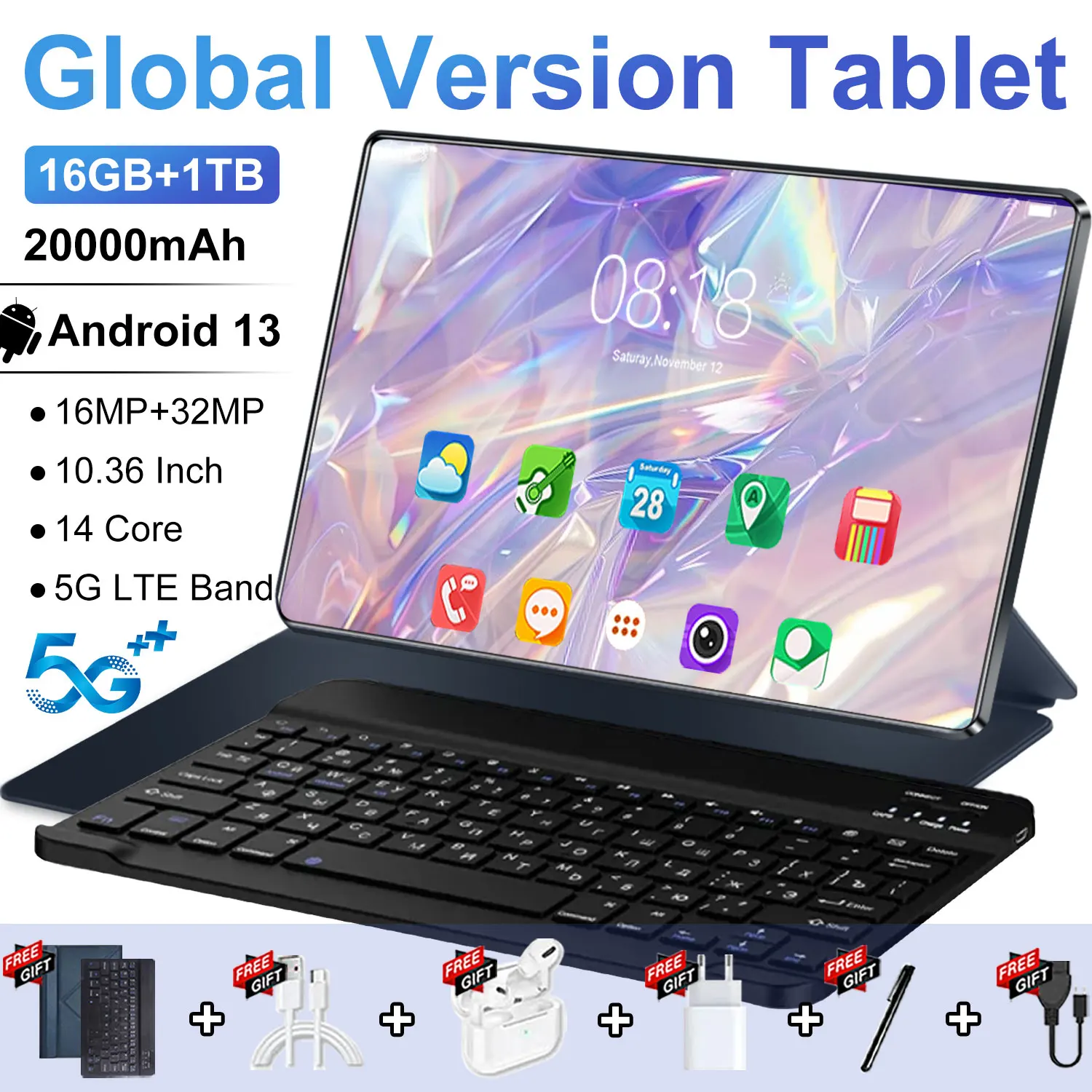 Tablet 5G Originale con Android 13, 16GB di RAM, 1TB di ROM, Schermo da 10,36 Pollici, Batteria da 20000mAh, Bluetooth, 14 Core, WIFI, GPS, HD, con Tastiera