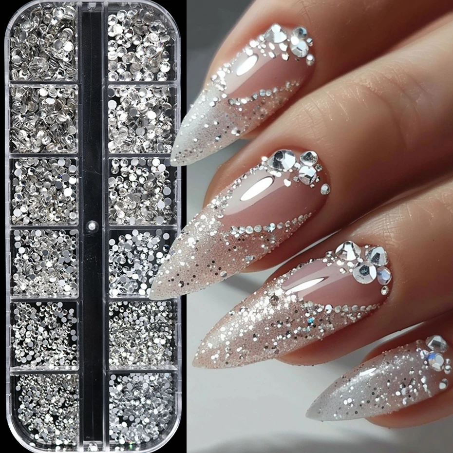 12 Griglie di Decorazioni per Unghie con Strass Argentati a Fondo Piatto, Cristalli Brillanti e Paillettes Diamantate per Unghie, Adatte per Decorazioni di Matrimoni e Feste