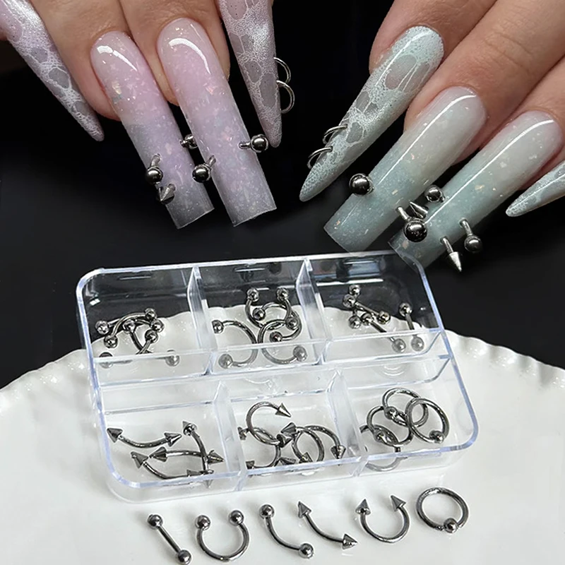 30 pz/scatola 6 Griglie Nail Piercing Punk Fascino In Lega di Metallo Traforato Nero/Bianco Unghie Decorazione Dei Monili 3D Fornitura di Unghie Per La Ragazza Fredda