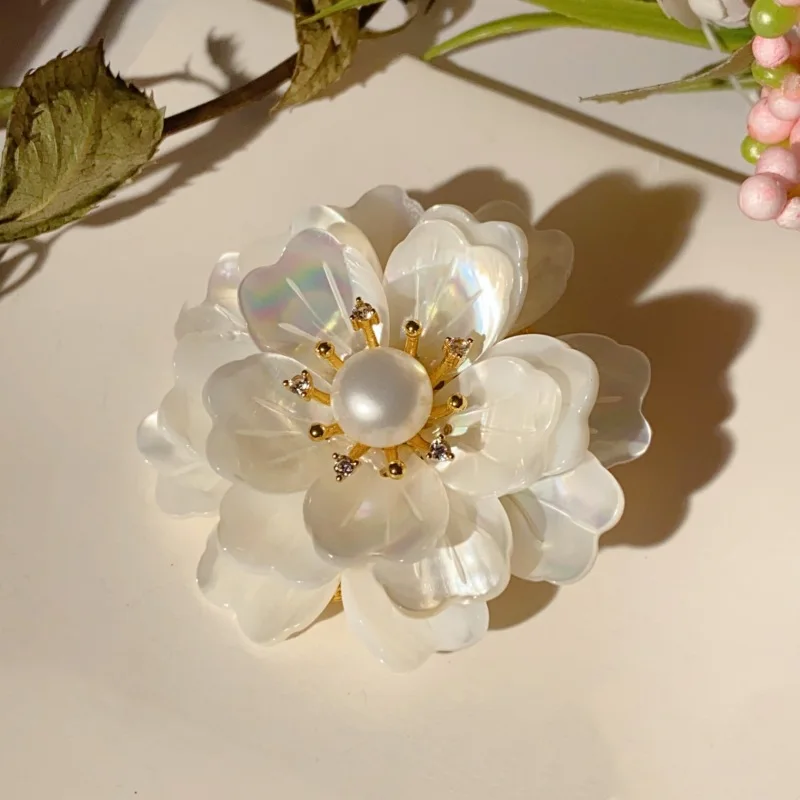 MINWEEN Spilla a forma di fiore in conchiglia di perla naturale, spilla a forma di fiore in madreperla per donna