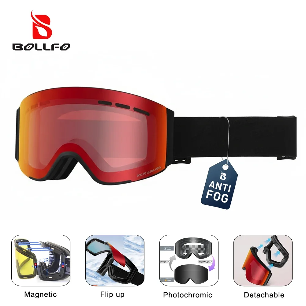 BOLLFO Occhiali da sci magnetici ribaltabili UV400 Occhiali OTG antiappannamento a doppio strato Spugna staccabile Freeride Occhiali da neve fotocromatici