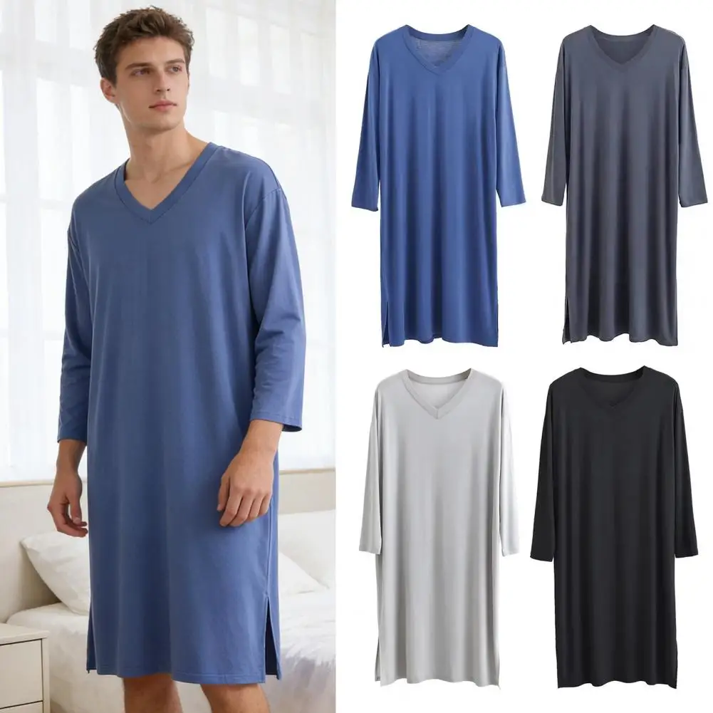 Camicia da Notte Estiva da Uomo con Scollo a V, Maniche Lunghe, in Morbido Tessuto Modal, Vestaglia Monocolore, Vestibilità Comoda, Abbigliamento Casual per Casa e Camera da Letto