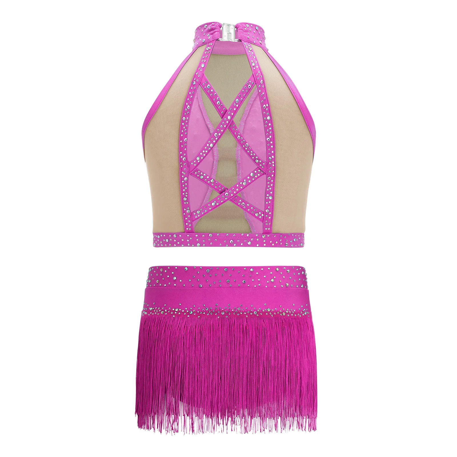 Set da ballo latino Rumba per bambine con frange, costume da ballo Tango Salsa con nappe, top corto in rete con strass e gonna a vita bassa