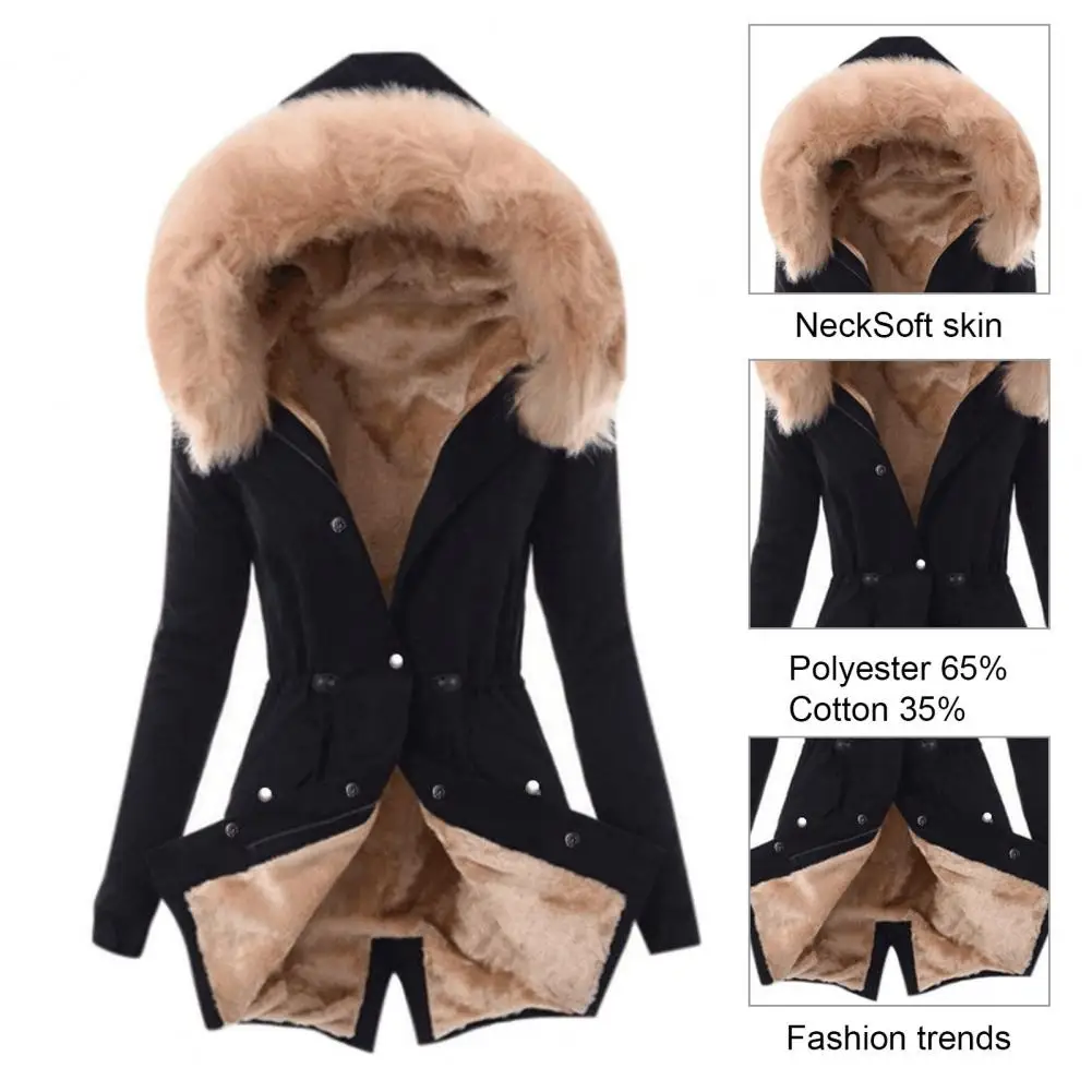 Addensare Cappotto invernale da donna in cotone Cappuccio in pelliccia sintetica Giacca con bottoni con cerniera in pile Capispalla slim di media lunghezza antivento