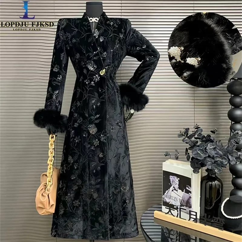 Cappotto invernale in pelliccia di volpe jacquard con paillettes ricamate floreali vintage di fascia alta Cappotto in velluto imbottito di media lunghezza da donna