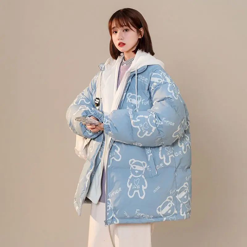 Cappotti di cotone con cappuccio con stampa Little Bear Cappotti caldi addensati in due pezzi finti larghi 2025 Nuove tasche invernali Cappotti dolci casual
