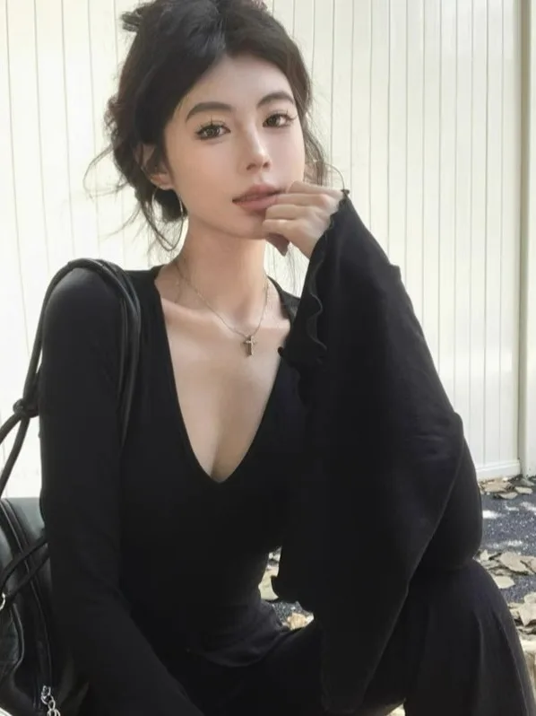 American Retro Sexy Lady Sle Split Slim Fit V-ne Base sottile irt Sensuale campana da donna Sve Boting Ins Faion Top