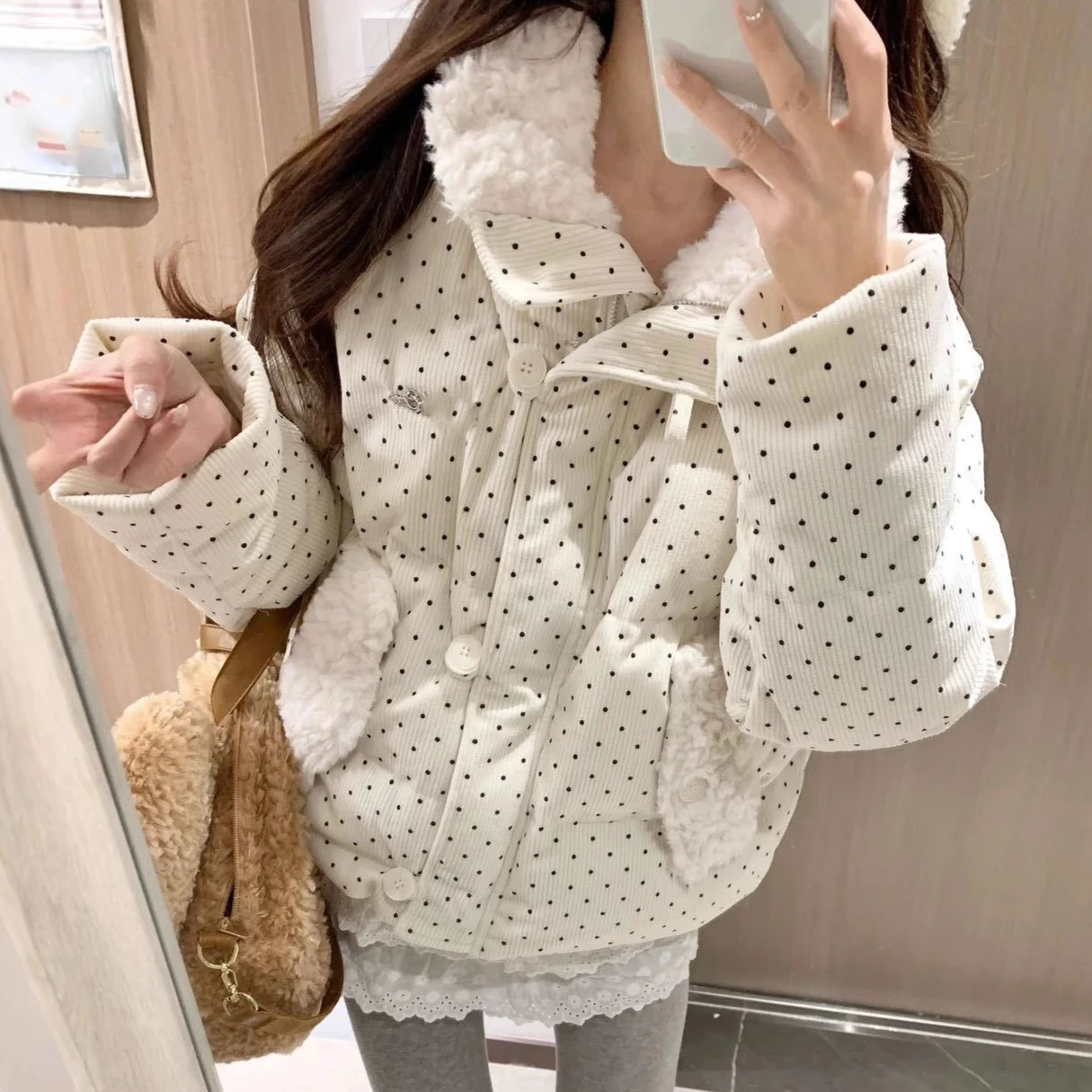 Cappotto Parka a Pois da Donna, Giacca Corta con Bottoni e Cerniera, Tasche, Colletto Alto, Maniche Lunghe, Spesso, Ampio, Casual da Ufficio, Inverno 2026