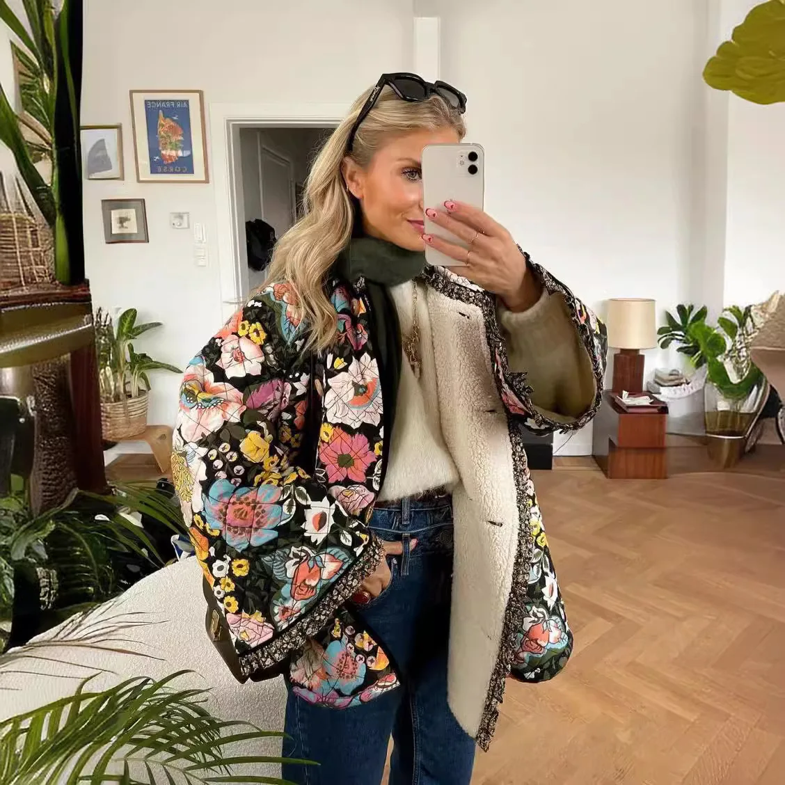 Giacca trapuntata Donna y2k Abbigliamento Stampa floreale Girocollo Manica lunga Cappotto imbottito Top Abiti caldi Anni 2000 Streetwear