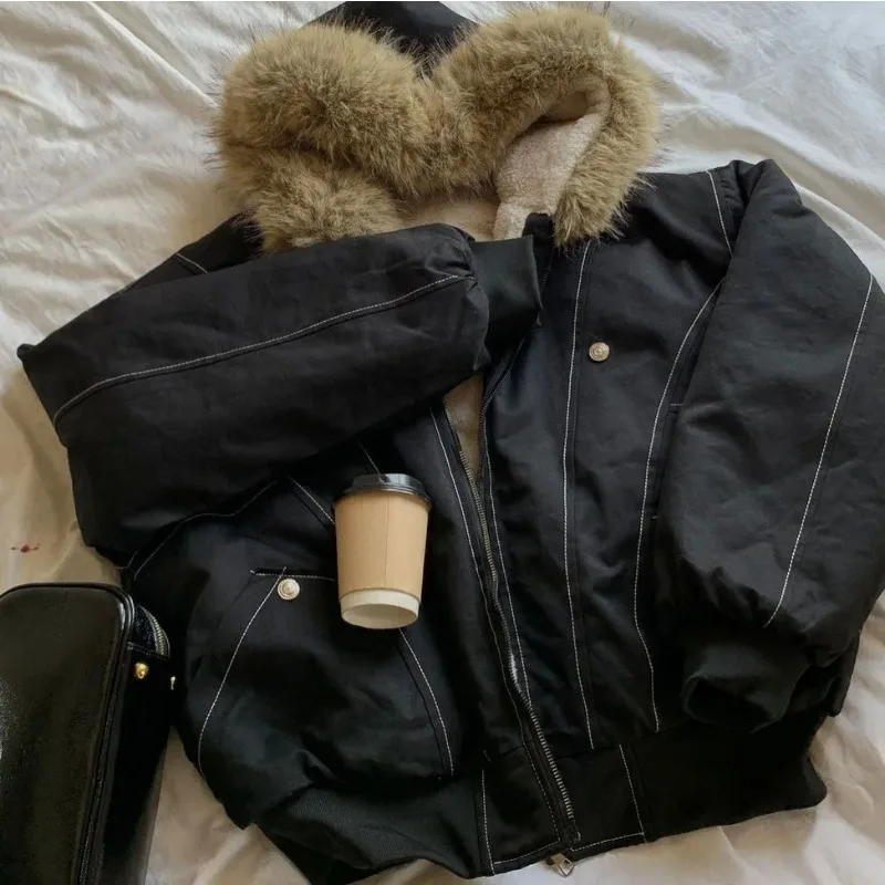 Parka Donna Cappotti corti Cerniera con cappuccio Manica intera Spessore caldo Y2k Streetwear Elegante cappotto da lavoro con giunture Autunno Inverno 2025