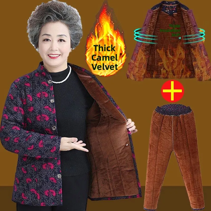 Set Invernale Caldo in Cotone e Piumino di Cammello, Giacca e Pantaloni a Due Pezzi per Donne di Mezza Età e Anziane, Cappotto Foderato in Pile per Nonna