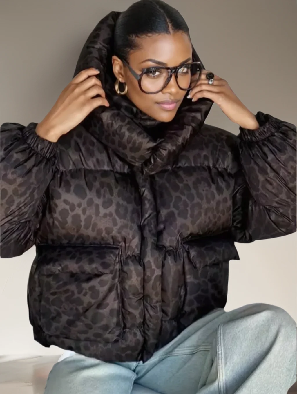 2026 Inverno Lady Street Capispalla caldi Nuovo Casual Stampa leopardata Piumino con cappuccio Donna Colletto alla coreana Cerniera Cappotto corto gonfio
