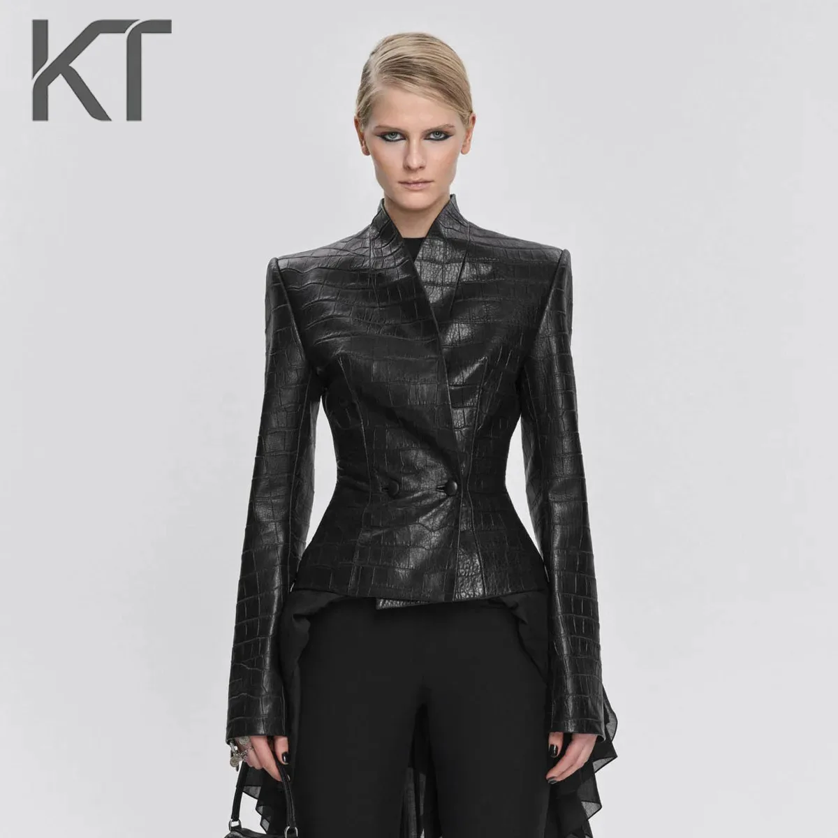 Giacca in pelle Slim Fit da donna con tuta da moto, colletto grande in piedi, top in pelle da esterno con cerniera nera autunnale