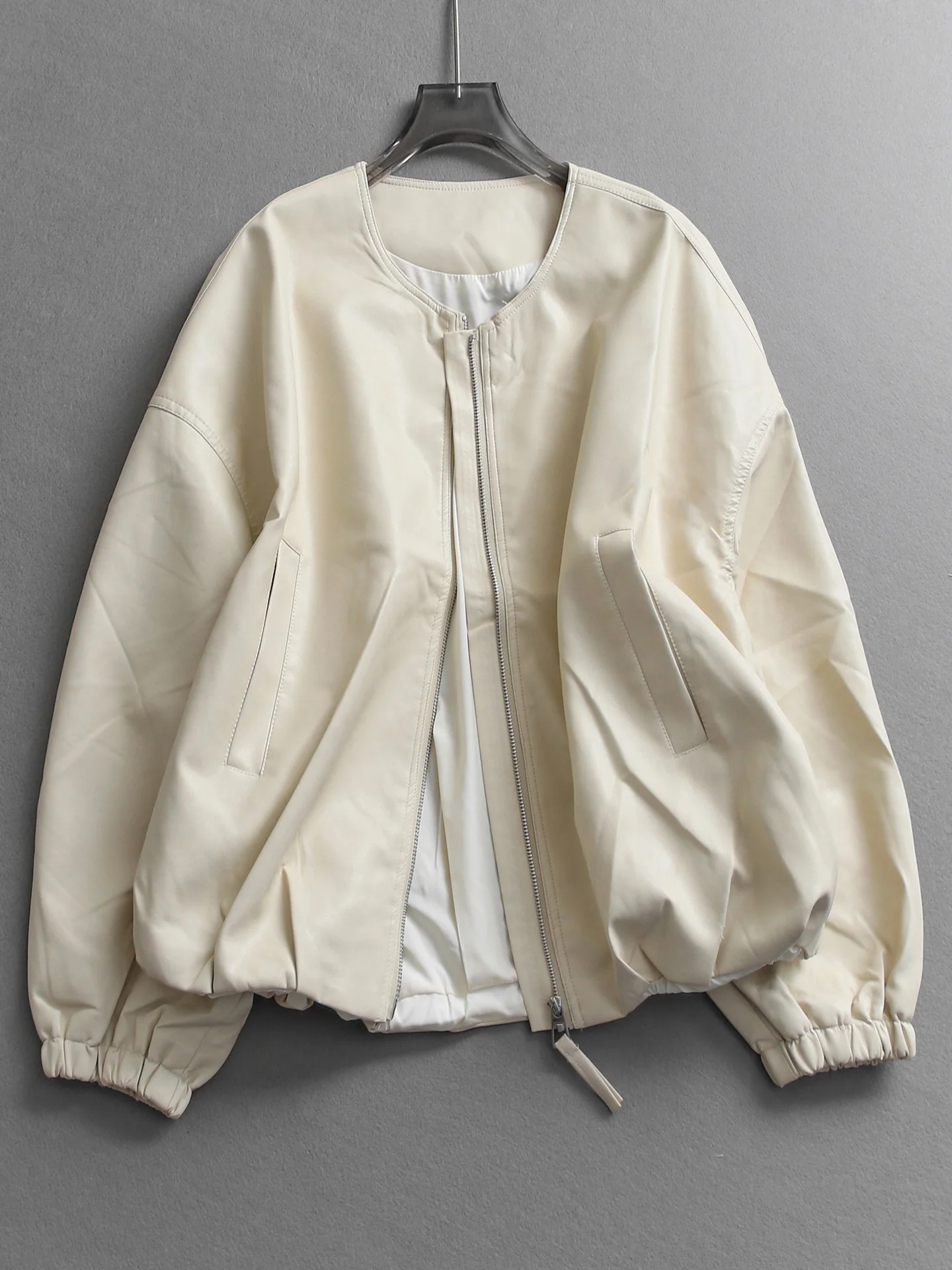 Giacca in Pelle da Donna Primavera 2026, Vestibilità Ampia, Maniche Lunghe, Collo Tondo, Stile Coreano, Tinta Unita, Silhouette Snellente