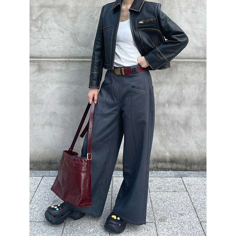 PBAP Donna Pintuck Abito grigio drappeggiato Pantaloni lunghi Vita alta Pantaloni larghi larghi dritti solidi Cleanfit Vintage Streetwear