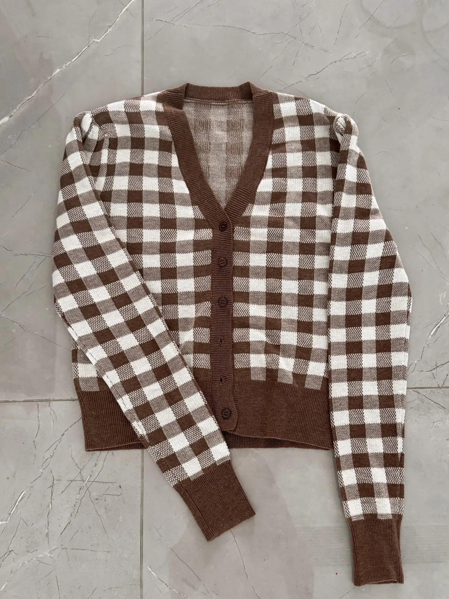 Cardigan lavorato a maglia con scollo a V e chiusura monopetto da donna + Mini abito a tracolla con stampa scozzese senza spalline