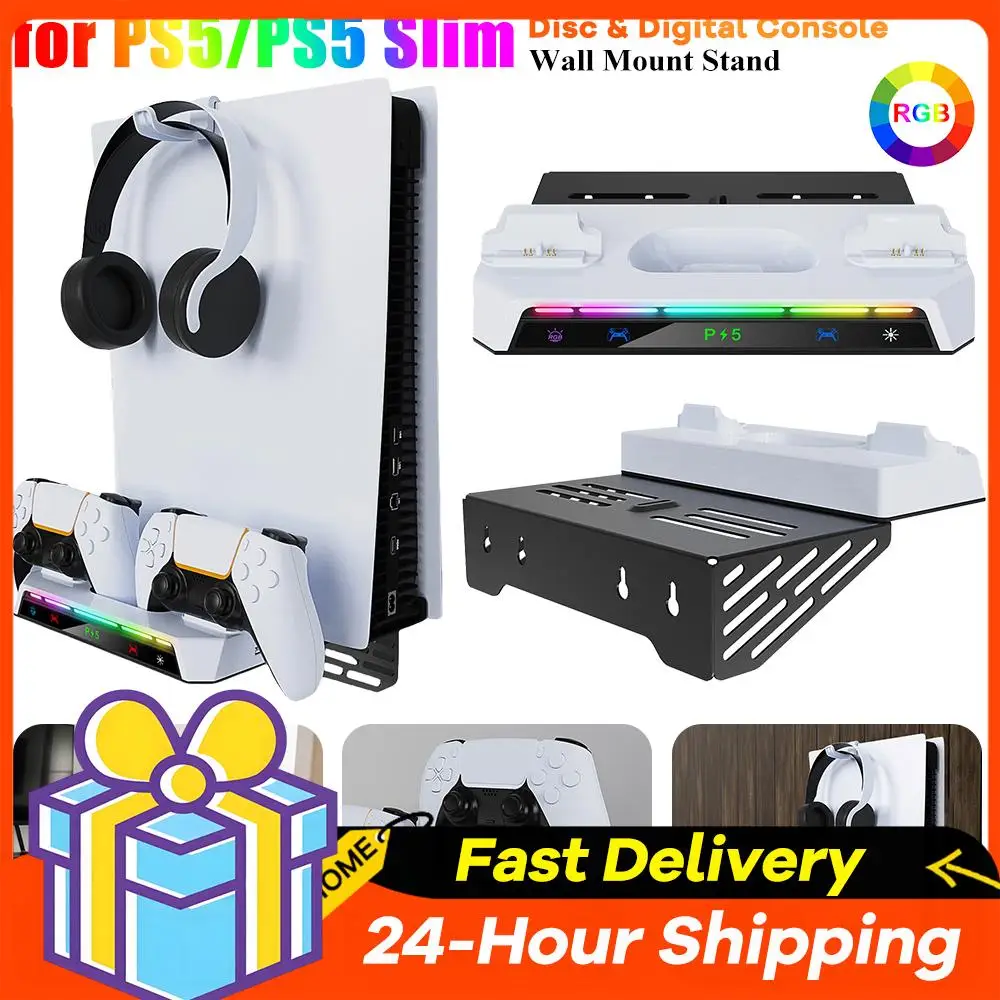Supporto da Parete in Metallo per Console PS5/PS5 Slim/PS5 Pro, Kit di Montaggio a Muro per Versione Disco e Digitale con Porta Controller Doppio