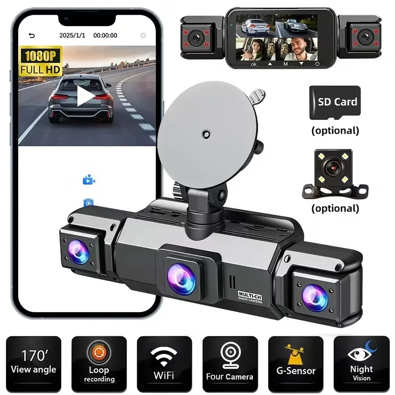 FHD 1080P 3/4 Canali 360° ° Dash Cam, WiFi, Visione Notturna IR, Registrazione in Loop, Schermo IPS, Batteria da 150mAh, 12-24V