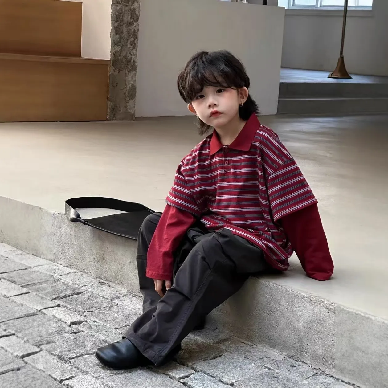Felpa Casual in Stile Coreano con Colletto a Righe e Design Patchwork a Maniche Lunghe per Bambini e Ragazzi