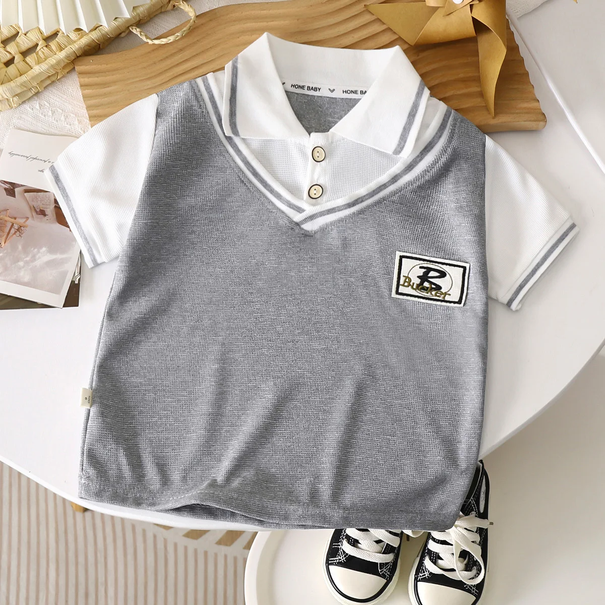Abbigliamento estivo per neonati, tendenza casual, polo in cotone per bambini, top con risvolto per tutti i giorni, stampa geometrica con lettere, maniche corte per bambini
