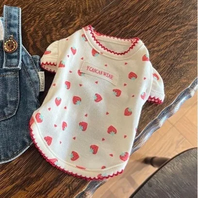 Nuovi vestiti per animali domestici Base fragola Manica gonfia T-shirt per cani sottile Design alla moda in pizzo Vestiti per cani carini Vestiti natalizi per cani