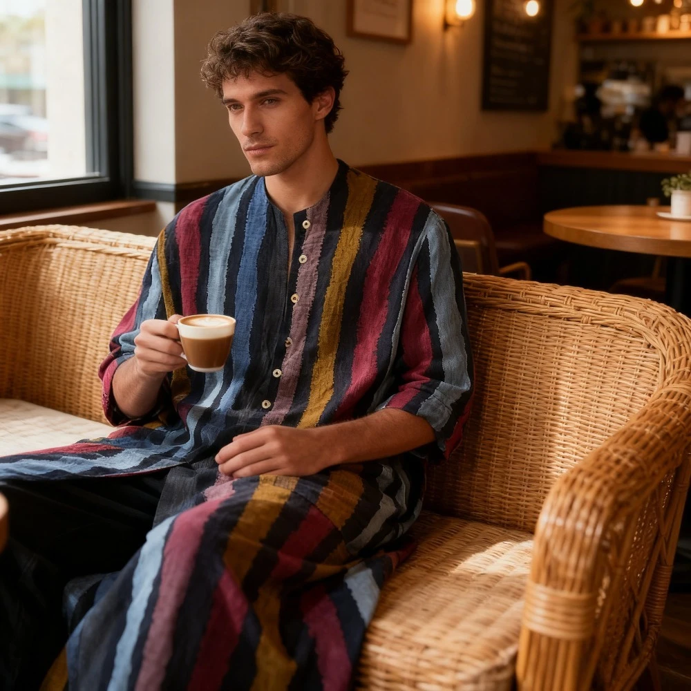 Nuova Tunica Musulmana a Righe Stampata in Cotone 2026, Camicia a Maniche Lunghe per Uomo Arabo per Uso Quotidiano