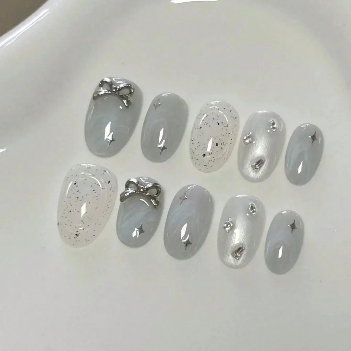 10 pezzi di unghie ovali pressate a mano, bellissime unghie finte, fiocchi grigio-argento, adatte alle donne